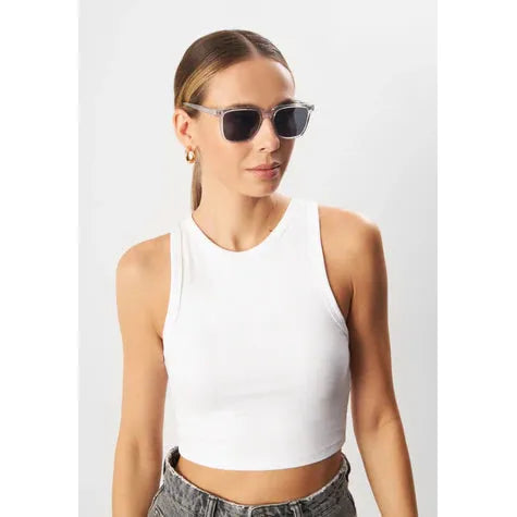 Die Rubino Clear Sonnenbrille verfügt über ein schlankes, transparentes Gestell, das mit dunklen Gläsern kombiniert ist. Das leicht übergroße Design des Rahmens verleiht eine moderne und minimalistische Ästhetik, perfekt für einen schlichten, eleganten Look. Das klare Gestell schafft einen vielseitigen Stil, der einfach mit jedem Outfit kombiniert werden kann, was diese Sonnenbrille zu einem unverzichtbaren Accessoire macht.