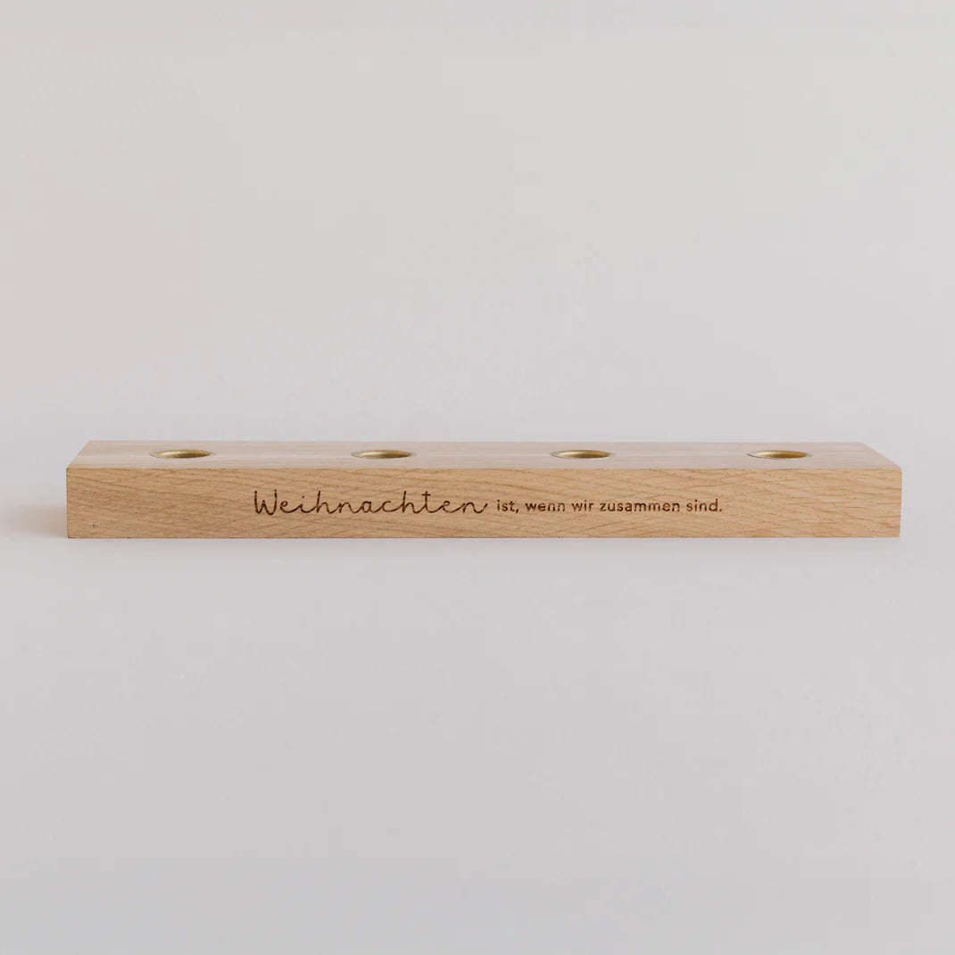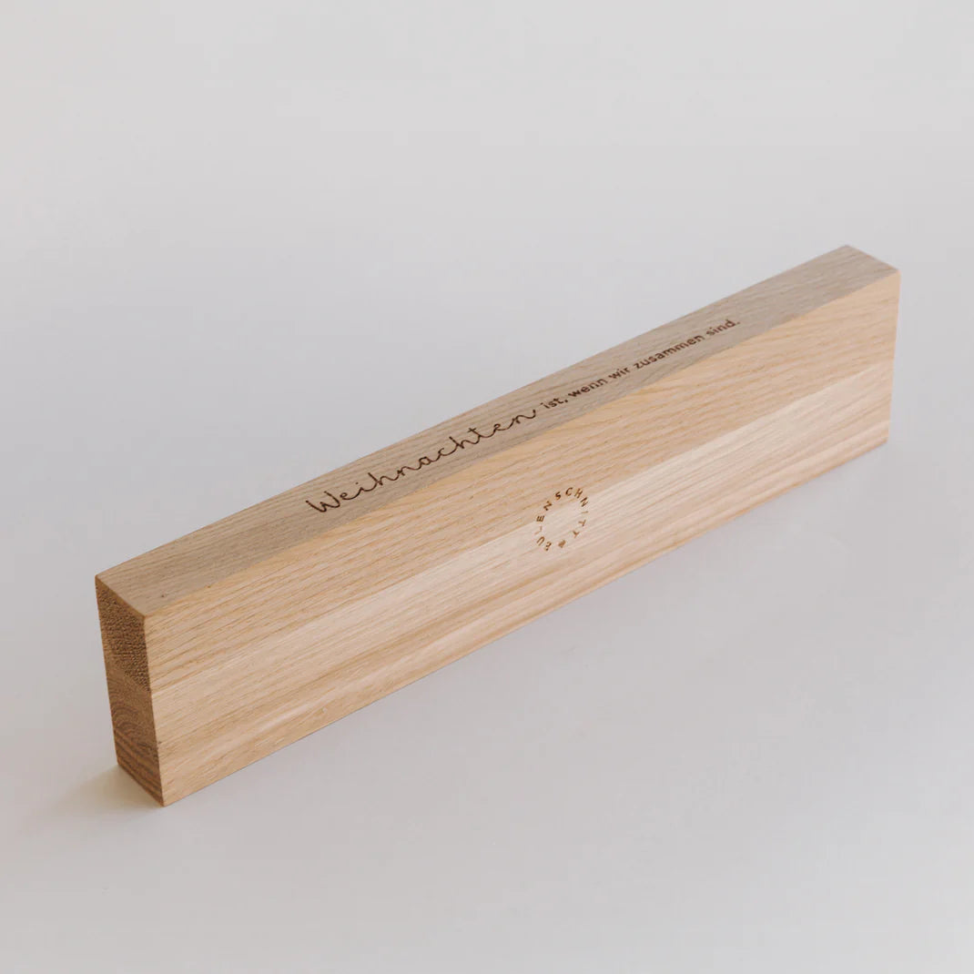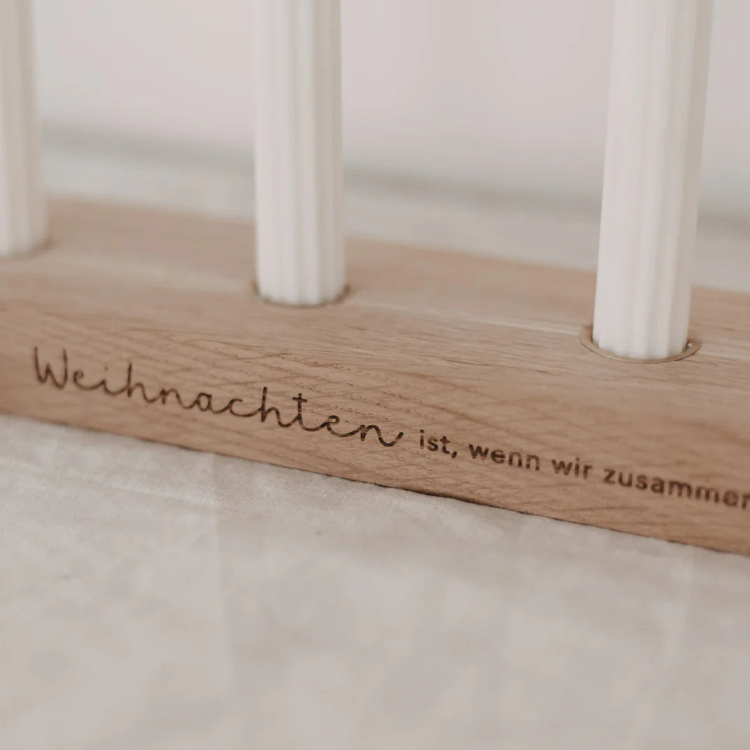 Für die weihnachtliche Stimmung und die gemütliche Adventszeit ist das schlichte und minimalistische Adventskerzenbrett genau das Richtige. Der eingefräste Spruch „Weihnachten ist, wenn wir zusammen sind“ bringt Weihnachtsstimmung und Vorfreude auf die Zeit mit deinen Liebsten. Es passt an jeden Lieblingsort - ob Couchtisch, Esstisch, Kommode, Fensterbank oder Regalbrett. So machen die Adventssonntage doch gleich noch viel mehr Spaß!