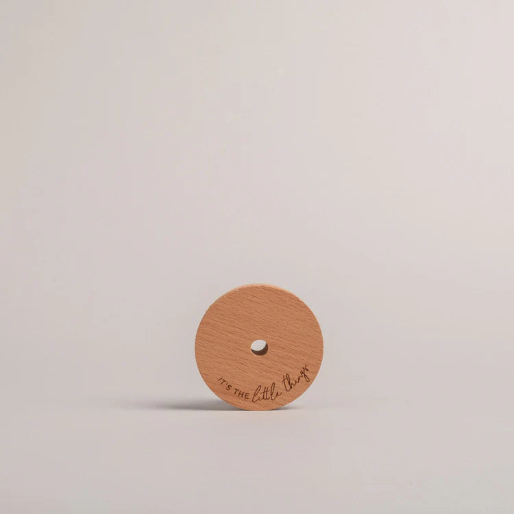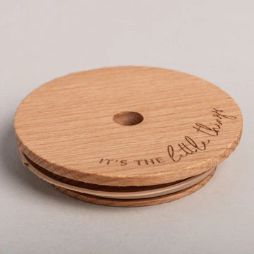 Der Deckel ist aus FSC-zertifiziertem Buchenholz sowie Elastomer gefertigt und hat in der Mitte ein Loch für einen Strohhalm. Die Oberseite ziert der Spruch "It's the little things" und die Unterseite unser Eulenschnitt Logo.