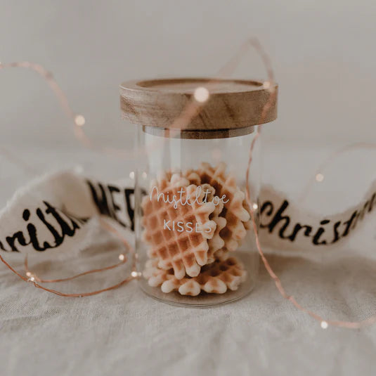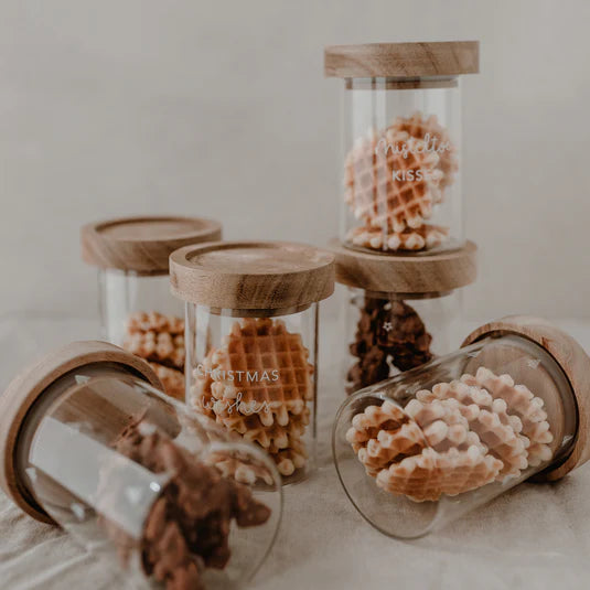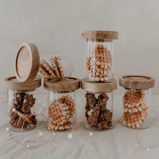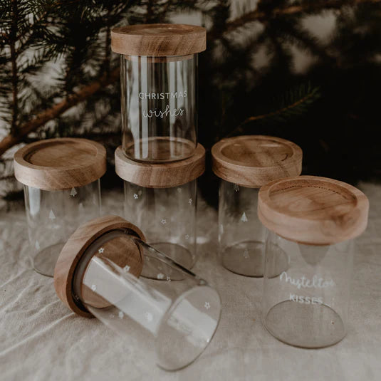 Entdecke unsere wunderschönen und praktischen Mini Vorratsgläser Christmas aus Borosilikatglas mit Akazienholz Deckel von Eulenschnitt