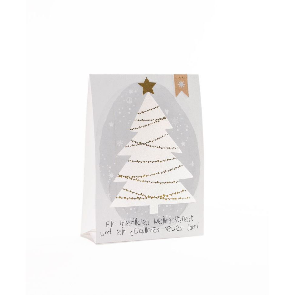 Die Vorderseite ist mit einem modernen Weihnachtsbaumdesign, goldenen Akzenten und dem Gruß -Ein friedliches Weihnachtsfest und ein glückliches neues Jahr- veredelt! Auf der Rückseite hast du Platz für persönliche Worte.