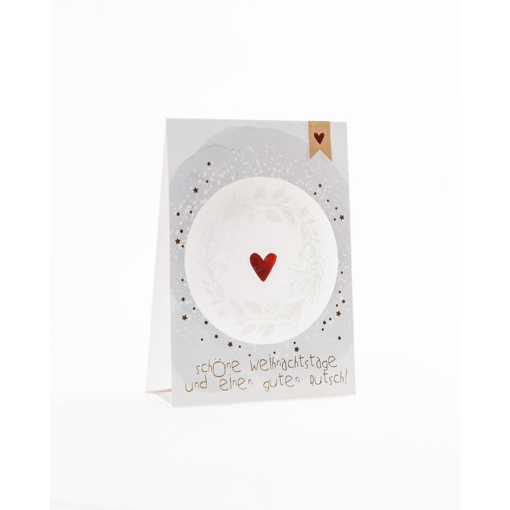 Die Vorderseite ist mit einem verspielten Kranz und rotem Herz, goldenen Akzenten und dem Gruß -Schöne Weihnachtstage und einen guten Rutsch- veredelt! Auf der Rückseite hast du Platz für persönliche Worte.