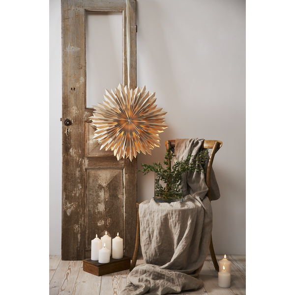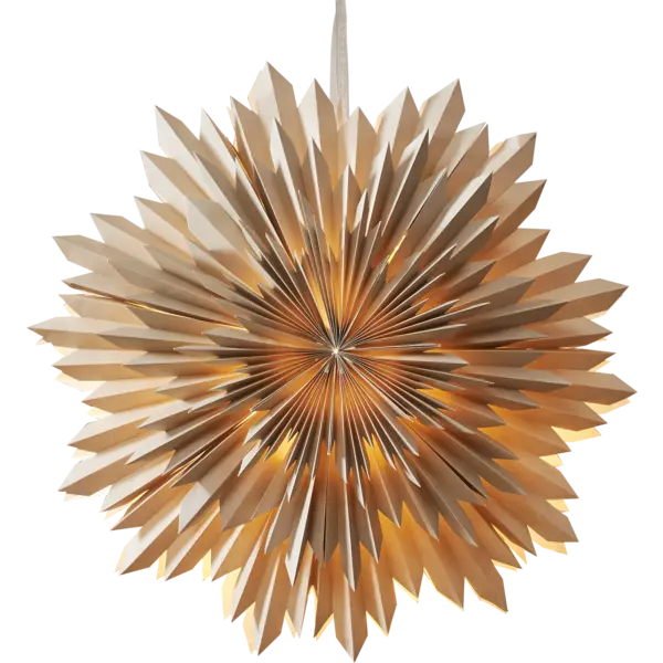 Magischer Papierstern aus zwei Lagen gefaltetem Papier. Das Papier wird aus recycelten Baumwollabfällen aus der T-Shirt-Herstellung hergestellt. Die Struktur des Papiers wird dadurch weich und im Papier selbst sieht man Punkte mit Wasserzeichen. Die Kontur ist ein wenig uneben, um ein winterliches Gefühl zu vermitteln. Ein elegantes Band wird mitgeliefert, um das Aufhängen des Sterns zu erleichtern. Der Stern verbreitet Atmosphäre und verleiht Ihrem Zuhause eine besondere Advents- und Weihnachtsstimmung. Kann sowohl in ein Fenster als auch an eine Wand gehängt werden.