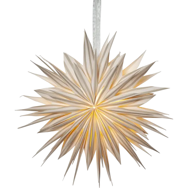 Ein wunderschöner magischer Papierstern aus drei Lagen gefaltetem Papier. Bedruckte Streifen in beige/elefantfarben. Die Kontur ist gelappt für ein winterliches Gefühl. Der Stern verbreitet Atmosphäre und verleiht Ihrem Zuhause eine besondere Advents- und Weihnachtsstimmung. Er kann sowohl in einem Fenster als auch an einer Wand aufgehängt werden.