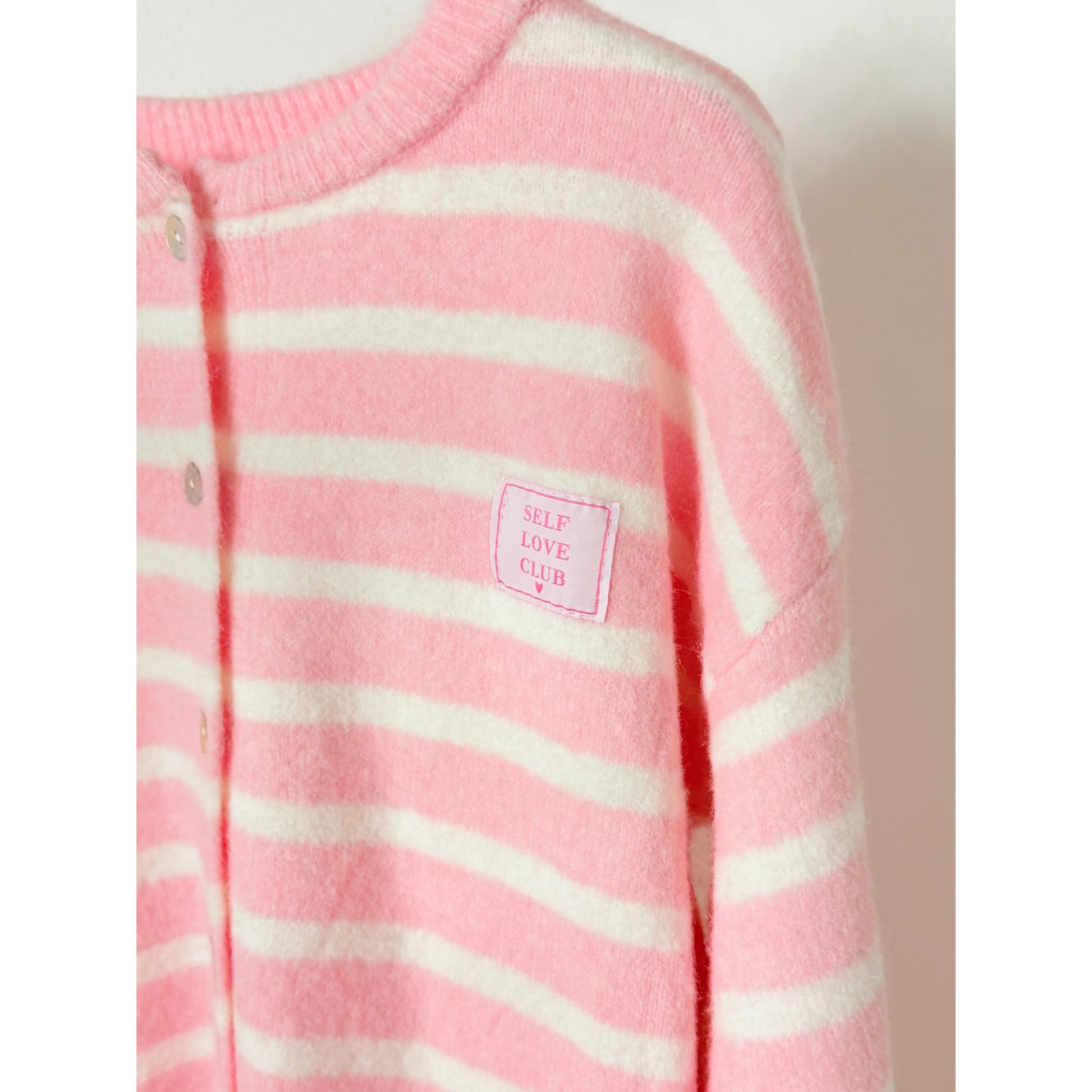 Diese rosa - weiß gestreifte Strickjacke ist der perfekte Allrounder für jedes Outfit. Mit dem Patch auf der Brust versprüht sie genau die richtige Portion Leichtigkeit die jeder manchmal braucht und sorgt für eine gemütlichen und zuckrig rosa Look.
