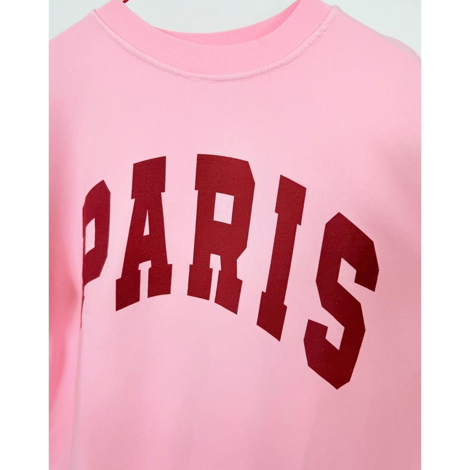 Dieser pinke Sweater mit der roten Aufschrift "Paris" bringt gute Laune und Stil. Bequem, stylisch- ein echter Hingucker für jeden Tag.